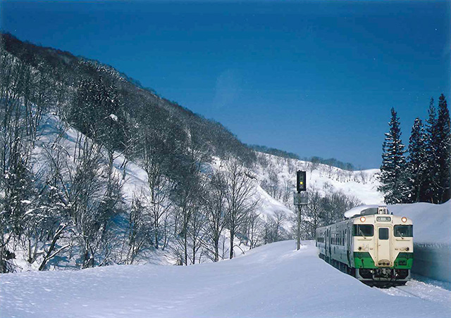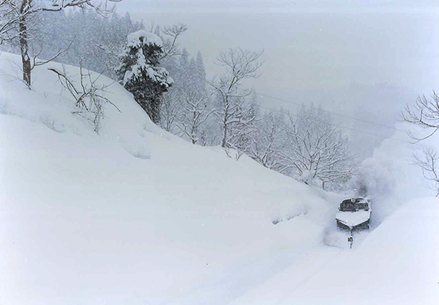 赤字路線切り捨ての理念からすれば、国鉄民営化の時に廃止を余儀なくされただろうが、現在もJR東日本のお荷物になりながらも存続しているのは、福島-新潟県境の豪雪による冬季国道閉鎖の代替交通機関の役目である。しかし、この県境区間を訪れるにはそれなりの覚悟と装備が必要になる。寒気が入れば視界もなくなり、冗談抜きで遭難の危険が伴う。2月7日魚沼市大白川からカンジキを履いての撮影、つかの間の抜けるような青空、鉄道写真屋同士で交わされる合言葉“天気が良いは七難隠す”そんな表現がぴったりの画像を記録できたのも幸運であった。秋の燃えるような紅葉が織りなす情景とは全く違う、静寂でしかし贅沢な空間を独り占め。40年経った今もそんな“一瞬”を追い求めている。