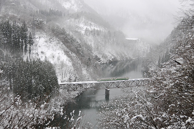 JR只見線第三只見川橋梁、時々刻々猫の目のように変わる景色、列車通過の15分くらい前には川霧ですっかり鉄橋は霞んでいた。雪も断続的に降り、遠距離撮影は無茶だったかな・・。ところが、遠くから汽笛が聞こえてきたときに、す~っと風が流れ、霧が川面の奥に流れて行った。モノトーンの風景に一本だけ緑のライン、そんな想い通りの画像になったのは、偶然と幸運の結果だった。きっと故人がそうしてくれたのだろうな、と思う。私にとっては鎮魂の風景になった。