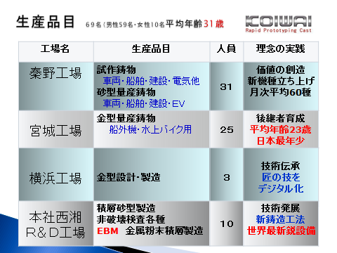 2013年3月現在正社員数69名平均年齢31歳は業界でも若い部類となります。若い=鋳造経験者が少ないという欠点も備えます。
