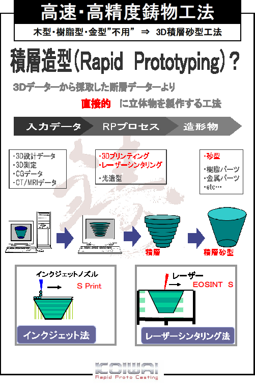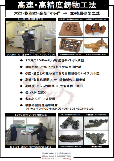 - RP 砂型積層工法による各種鋳物の試作鋳造品・並びに積層砂型の製造販売 【適用材質】:アルミニウム・マグネシウム・鋳鉄・ダクタイル鋳鉄・ニレジスト耐熱鋳鉄・鋳鋼・ステンレス鋼・CAC等銅合金