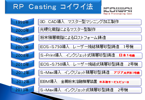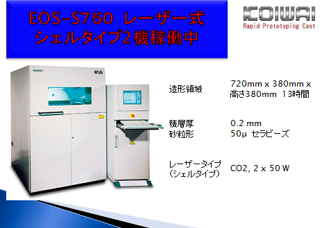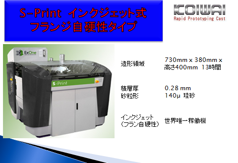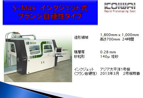 近年の積層装置の大型化により2012年S-Max(㈱EX_ONE社製、造形サイズ1800×1000×700)の導入により大型鋳物製品並びに小物多品種少量並びに量産工法に進化していく。