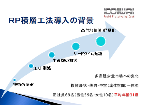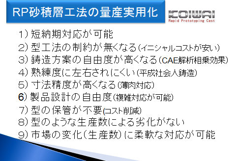 砂型鋳造には、型メーカーによる型供給が必須であったが、RP工法の採用により難易度の高い型が不要となり、型メーカーが悩む薄肉・複雑形状・後継者育成問題等が解決された。