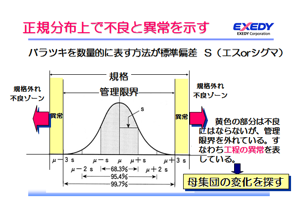 はじめに不良と異常について考えてみる。不良というのは製品が要求品質に対して規格から外れていることであり、異常は管理外れ、すなわち正規分布上で3シグマ管理限界内から外れていることである。前者の品質規格は顧客の要求に基づいて決められ、後者の3シグマ管理限界は品質規格とは無関係に、製造工程の品質のばらつき(群内変動)に基づいて決められる。従って規格外れは顧客の不満足につながるが、管理外れは工程に起こった異常、すなわち工程という母集団の変化を示すものである。これらの状況を正規分布上に示すと図1のようになる。