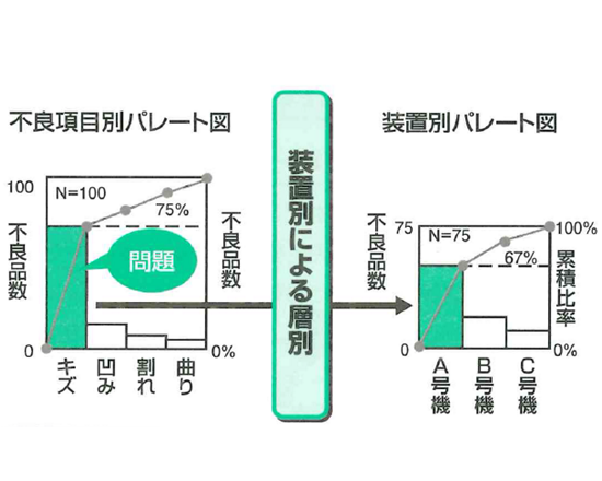 品質不良や工程内のトラブルの原因究明に層別の考え方は大変重要である。品質管理では「データで話をする」というが、そのデータに意味を持たせるために用いる方法で、データをその生まれの履歴毎に分けることにより。見えなかったことが見えてくる。「分けることはわかること」というよう、鋳物の不良を鋳造日毎、直別毎、時間毎、鋳造機械毎、型毎、原材料別、作業者毎等に分けてデータ化することで、問題の所在が見えてくる。すなわち、層別とは、特性(品質などのデータ)に影響を及ぼす数多くの因子を、どの因子が影響しているのかわかるようにするため、因子毎に分けて整理することである。