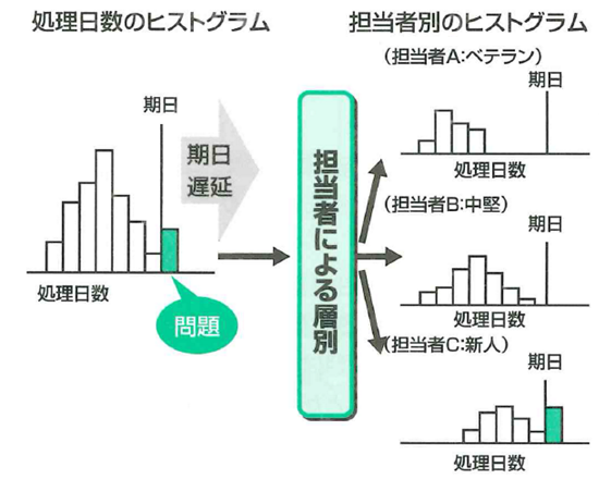 データを層別して比較すると、層別したデータの特徴と層別間の比較結果が見え、こうすることで特性に対する適当な対処法が発見できることになる。