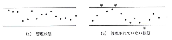 これに対し、工程に異常が起こると、その工程からの結果(特性値)のばらつきが異常に大きくなる。この異常なばらつきを管理されていないばらつき(uncontrolled variability) といい、このようなばらつきを持つ結果を生ずるような工程の状態を、管理されていない状態、不安定状態(uncontrolled state)という。図8の(b)のような状態で、限界から飛び出している点が出るとき、点の並び方にくせがあるときにその工程は管理されていない(out of control)という。