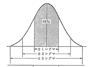 私たちが通常接する分布は、図92)のようなベル型をした分布、正規分布(normal distribution)に近いものが多い。このような分布を標準偏差で分けると、全体の面積に対する割合がわかる。すなわちランダムサンプリングすると±1σ内のデータが出る確率は約68%、これより外に出る確率は32%となり、±3σ外に出る確率は約0.3%と非常に少ない確率になる。このようなことは通常あまり起こらないので、3σよりデータが外に出たとき、工程が変わったとか工程に何か異常が起きた可能性があると判断することになる。